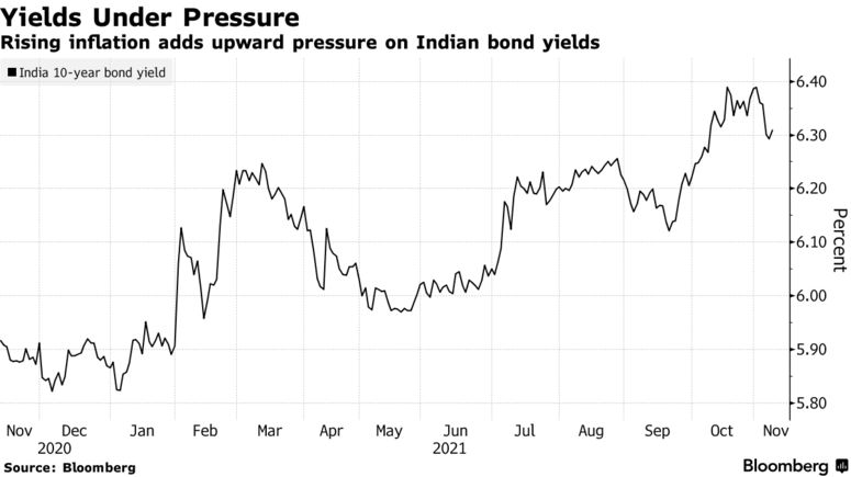 Yields on India’s benchmark 10-year government bonds have risen in the past five months amid surging inflation. The yields fell slightly after the Central Government cut taxes on retail fuels.